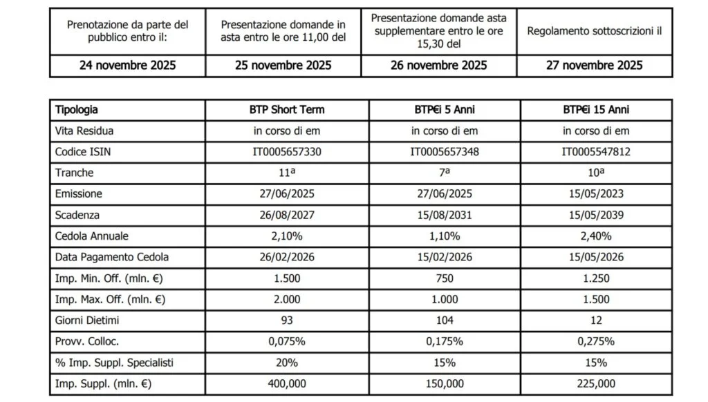 La data di pagamento della cedola è del 26 febbraio 2026 per BTP short term, del 15 febbraio 2026 per BTP€i 5 anni e del 15 maggio 2026 per BTP€i 15 anni.