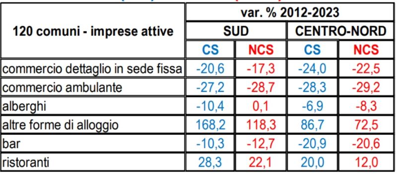 Come descritto nella tabella, nei centri storici (CS) del Centro-Nord si registra un calo del -24% per le attività di commercio al dettaglio in sede fissa, mentre al di fuori dei centri storici (NCS) il calo è del -22,5%. Non va meglio nemmeno per il commercio ambulante che segna -28,3% nei centri storici del Centro-Nord, e -29,2% nelle periferie.