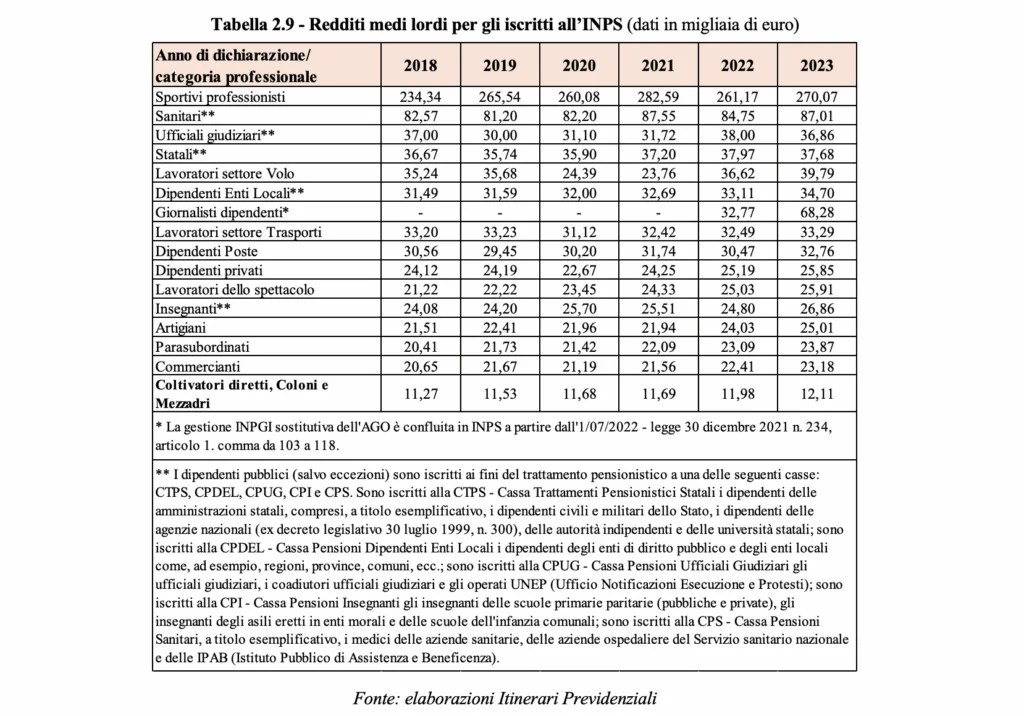 Secondo i dati dell’Osservatorio sulle entrate fiscali 2025, curato del Centro studi e ricerche itinerari previdenziali, in termini assoluti, dai dati delle dichiarazione dei redditi del 2024 (relativi ai redditi del 2023), i redditi medi più alti tra gli iscritti all’INPS sono stati dichiarati dagli sportivi professionisti, con 270.070 euro lordi annui.