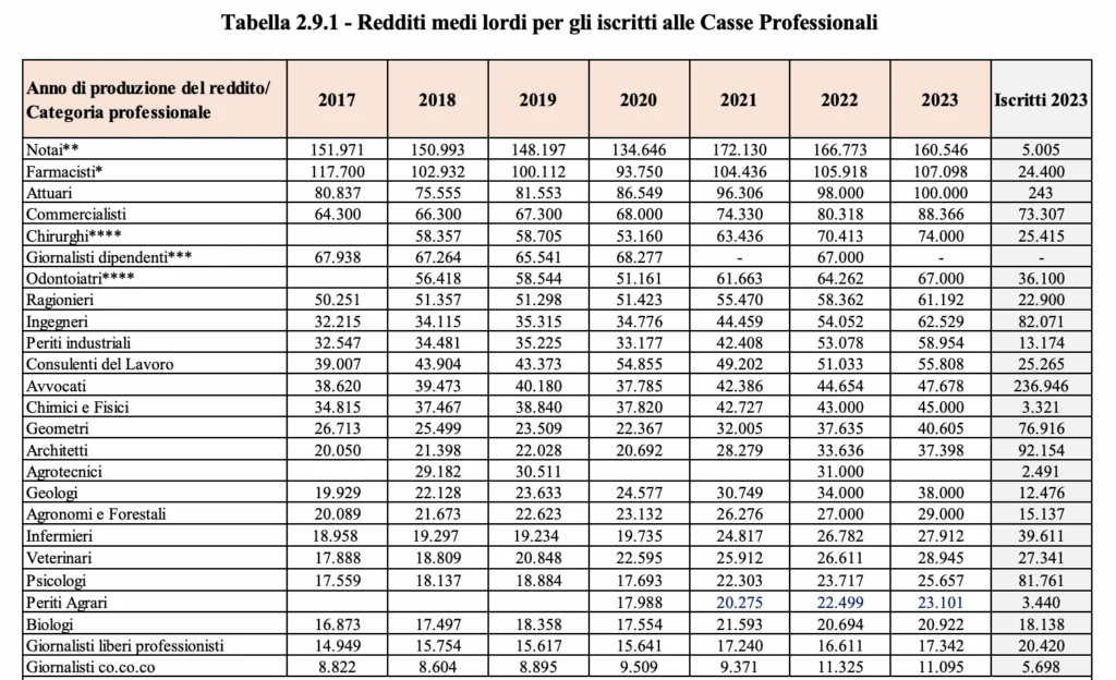 Passando ai professionisti iscritti alle Casse privatizzate, i dati mostrano redditi medi piuttosto variabili a seconda della professione e della dimensione del gruppo. A guidare la classifica ci sono i notai, con 160.546 euro lordi medi annui, sebbene in leggero calo negli ultimi anni, questa è anche la categoria che registra i tassi più bassi di evasione fiscale.
