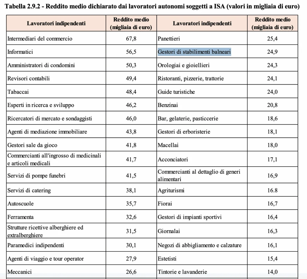 Tra i lavoratori dipendenti, invece, i soggetti a ISA che hanno il reddito più alto sono i panettieri, con 25,4 mila euro lordi annuali in media. Poi ci sono i gestori di stabilimenti balneari con 24,9 mila euro e subito dopo orologiai e gioiellieri con 24,3 mila euro.