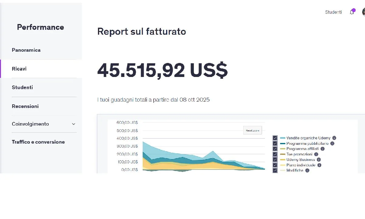 Dopo la fase creativa, la più gradita al project manager, arriva quella del marketing che il professionista preferisce “delegare” a una piattaforma specializzata. “Piattaforme come Udemy ti permettono di vendere il tuo corso senza dover pensare al lato marketing, alla creazione del funnel ad esempio che non è il mio forte, né di doverti occupare dei pagamenti”, fa sapere.
