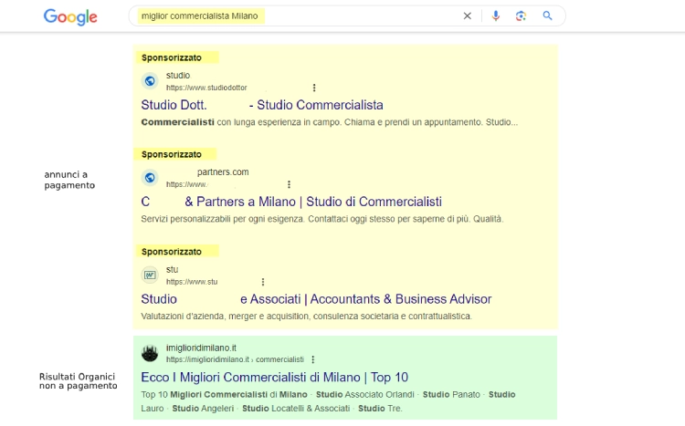 Sotto è possibile vedere un’immagine di come appare la serp (ovvero i risultati di una ricerca su Google), per la chiave “miglior commercialista Milano“. I primi 3 risultati sono dedicati agli annunci sponsorizzati e dopo, comincia l’elenco dei risultati cosiddetti “organici”, non a pagamento.