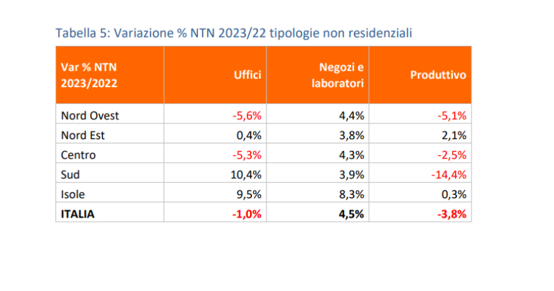 Mentre le compravendite che coinvolgono i negozi sono in aumento del 4,5% complessivo confrontando il 2023 con il 2022, risultano in discesa (-1,0%) quelli che riguardano gli uffici soprattutto nel Nord-Ovest dell’Italia, oltre al comparto produttivo (-3,8%).
