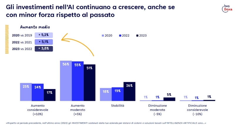 Come abbiamo anticipato, l’uso delle AI sta aumentando all’interno delle aziende di tutto il mondo, coinvolgendo anche il nostro paese. Questo comporta un investimento da parte delle imprese, in termini di nuove figure professionali, formazione e strumenti adeguati.