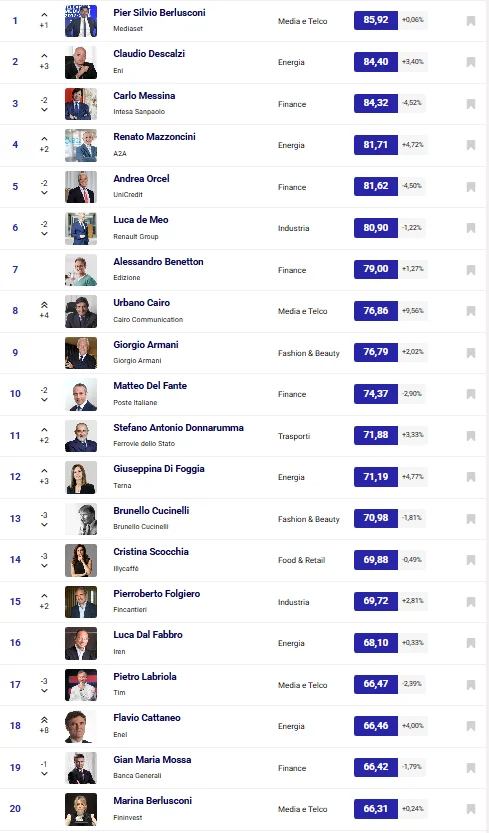 Come si può osservare, soltanto tre donne occupano la top 20: Giuseppina Di Foggia – che guadagna 3 posizioni – di Terna, grazie al progetto Innovation Zone Adriatico; Cristina Scocchia, ceo di Illycaffè; Marina Berlusconi di Fininvest, stabile al ventesimo posto. Tra le “risalite” più evidenti, invece, quella di Flavio Cattaneo, in virtù dei risultati di Enel in Borsa.