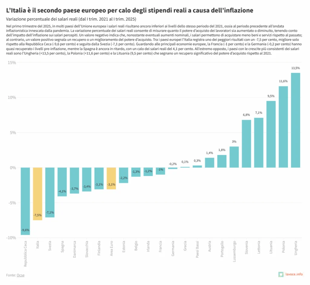 Dal 2021 a oggi, i salari reali in Italia sono scesi del 7,1%. Lo conferma l’ultimo rapporto sulle Prospettive occupazionali 2025 dell’OCSE, l’Organizzazione per la cooperazione e lo sviluppo economico (OECD). Mentre le retribuzioni restano al palo, i margini aziendali aumentano e, di conseguenza, alimentano uno squilibrio redistributivo che compromette domanda interna, coesione sociale e attrattività del lavoro. Per fare un’analisi delle cause e delle possibili soluzioni del calo dei salari reali, Partitaiva.it ha intervistato Marco Ferraresi, professore di diritto del lavoro all’Università degli Studi di Pavia e presidente della Commissione di certificazione dei contratti di lavoro presso lo stesso ateneo e Marco Magnani, docente di economia presso l’Università degli Studi di Parma.