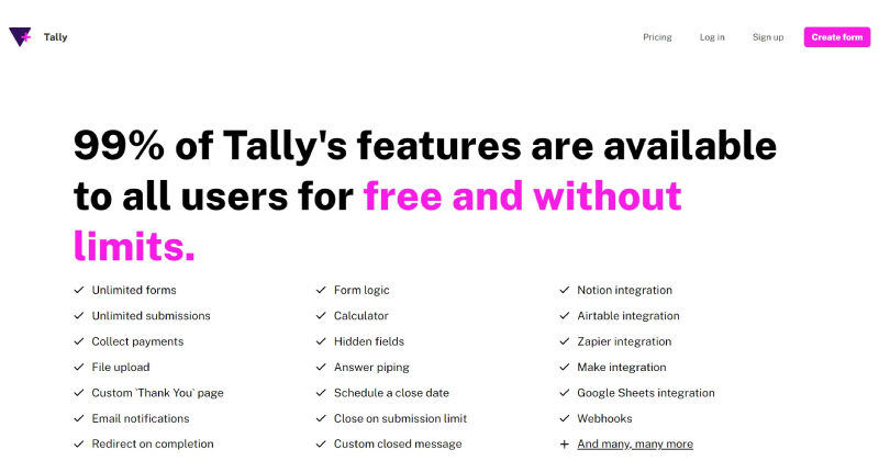 • nessun marchio Tally: è possibile rimuovere dai form il marchio Tally in modo che ogni modulo rappresenti perfettamente il marchio dell’utente che crea il form;